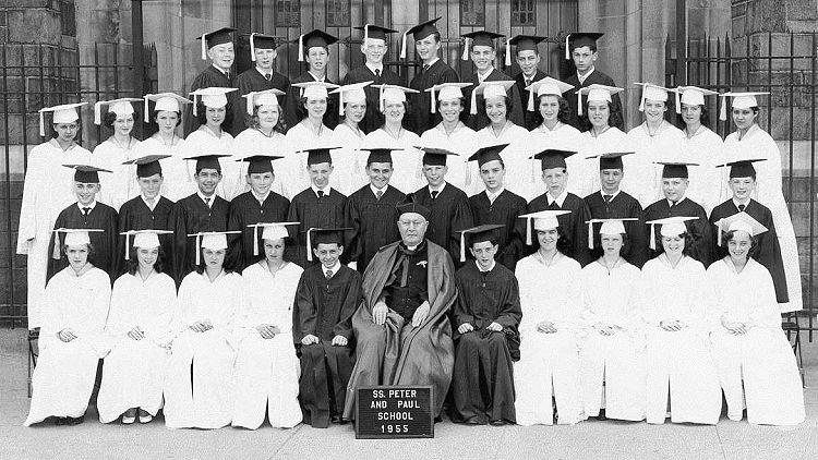 Margaret Murphy, Julia E. Curtin, Frances Toal, ?, James E. Munz, Msgr. Joseph McCarthy, Joseph P. Munz, Lourdes Mary