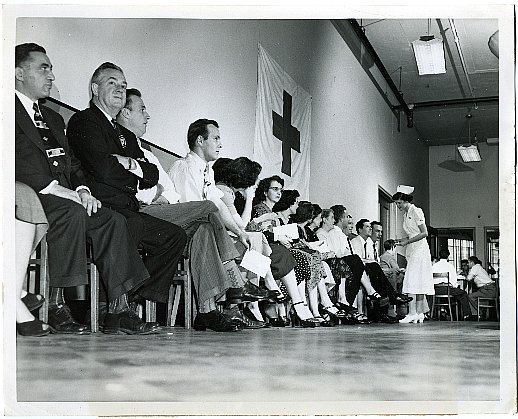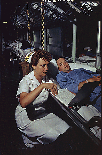 Lieutenant Commander Dorothy Ryan checks the medical chart of Marine Corporal Roy Hadaway of Calera, Alabama aboard the hospital ship USS repose off South Vietnam. Miss Ryan, from Bronx, New York is one of 29 nurses aboard the hospital ship selected from 500 volunteers of the Navy Nurse Corps., 04/22/1966