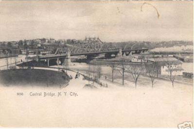 "Central Bridge" (also known as Macomb's Dam Bridge and the 155th Street Bridge) spanning the Harlem River and connecting 155th Street in Manhattan with 161st Street and Jerome Avenue in the Bronx. This bridge was for many years known as "The Baseball Bridge" because close to either end were professional baseball stadiums, the Polo Grounds in Manhattan and Yankee Stadium in the Bronx. The area in the forground is now covered by the Harlem River Drive. Note also the passenger railroad train on the Bronx side at the right.