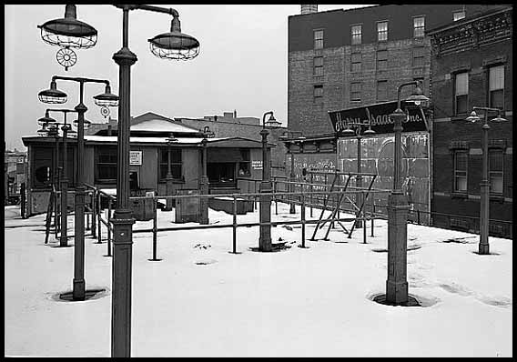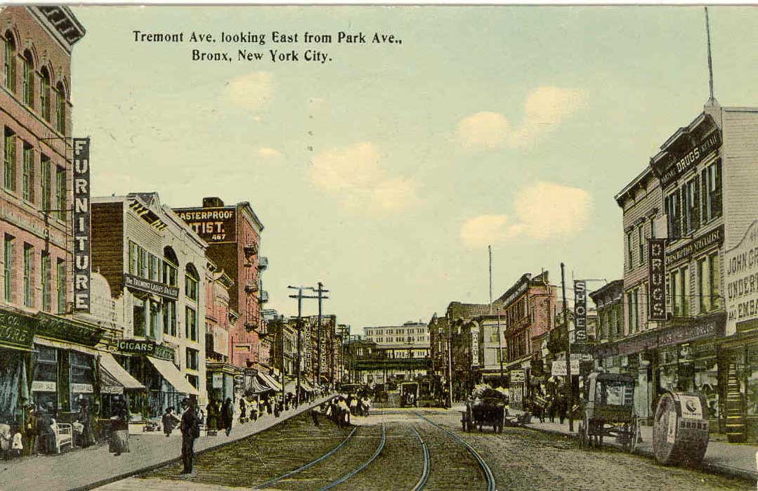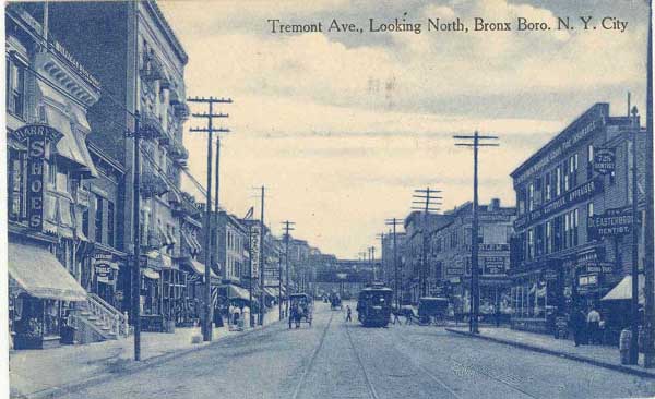The elevated subway train crosses Tremont. This view shows many retail establishments such as Harry's Shoes, Felter Hardware and Tools, Smith Auctioneers and