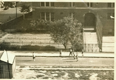 Taken from our fourth floor apartment rear window, this photograph (circa 1945) captures Peggy Ferguson apparently directing Joe-Joe to return home (I can be seen at the extreme right of the group) During WWII the ground beyond the Apple tree within P.S. 38’s fenced in perimeter was cultivated as a “Victory Garden”; green beans, carrots and the like were grown in support of the war effort. |